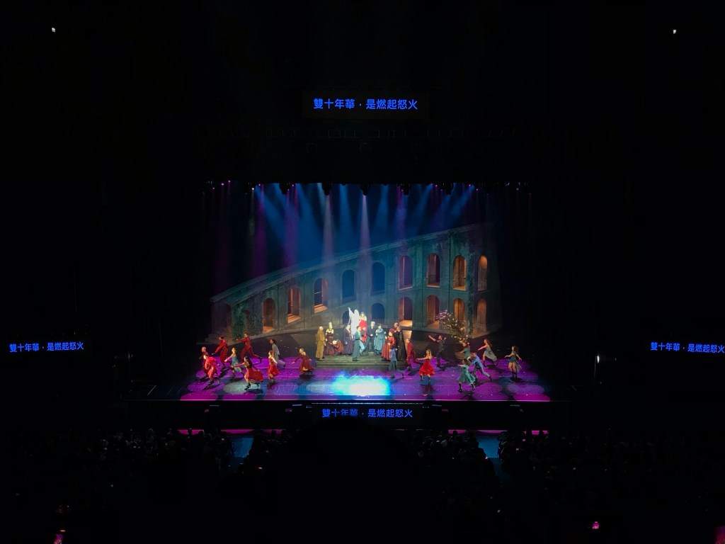 覺得 Damien 真的好強好穩!第一次聽他唱現場,但聲音真的跟原聲帶一樣,超感動的(嗚)!大概是從〈J’ai Peur〉那首開始大爆發!雖然現場沒有像2009年錄音室專輯那樣唱超長音,但聽到最高音還是起雞皮疙瘩,好喜歡!這裡科普一下《羅密歐與茱麗葉》原版是2001年首演,法文全名是《Roméo et Juliet: de la Haine à l’Amour》,後來又重新製作,修改編曲和增減幾首曲目,並在2009年出了一張錄音室專輯,稍微改名為《Roméo et Juliette: Les Enfants de Vérone》,羅密歐依然是原卡的 Damien。後來的巡迴都是新製作的版本,舞台佈景和服裝顏色感覺上都比較鮮豔。